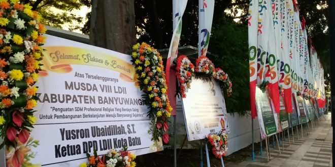Deretan karangan bunga ini sebagai bentuk dukungan digelarnya Musyawarah Daerah (MUSDA) VIII Lembaga Dakwah Islam Indonesia (LDII) Kabupaten Banyuwangi Tahun 2026. Perhelatan lima tahunan ini mengusung tema “Penguatan SDM Profesional Religius yang Berdaya Saing untuk Pembangunan Berkelanjutan Menuju Banyuwangi Sejahtera.”